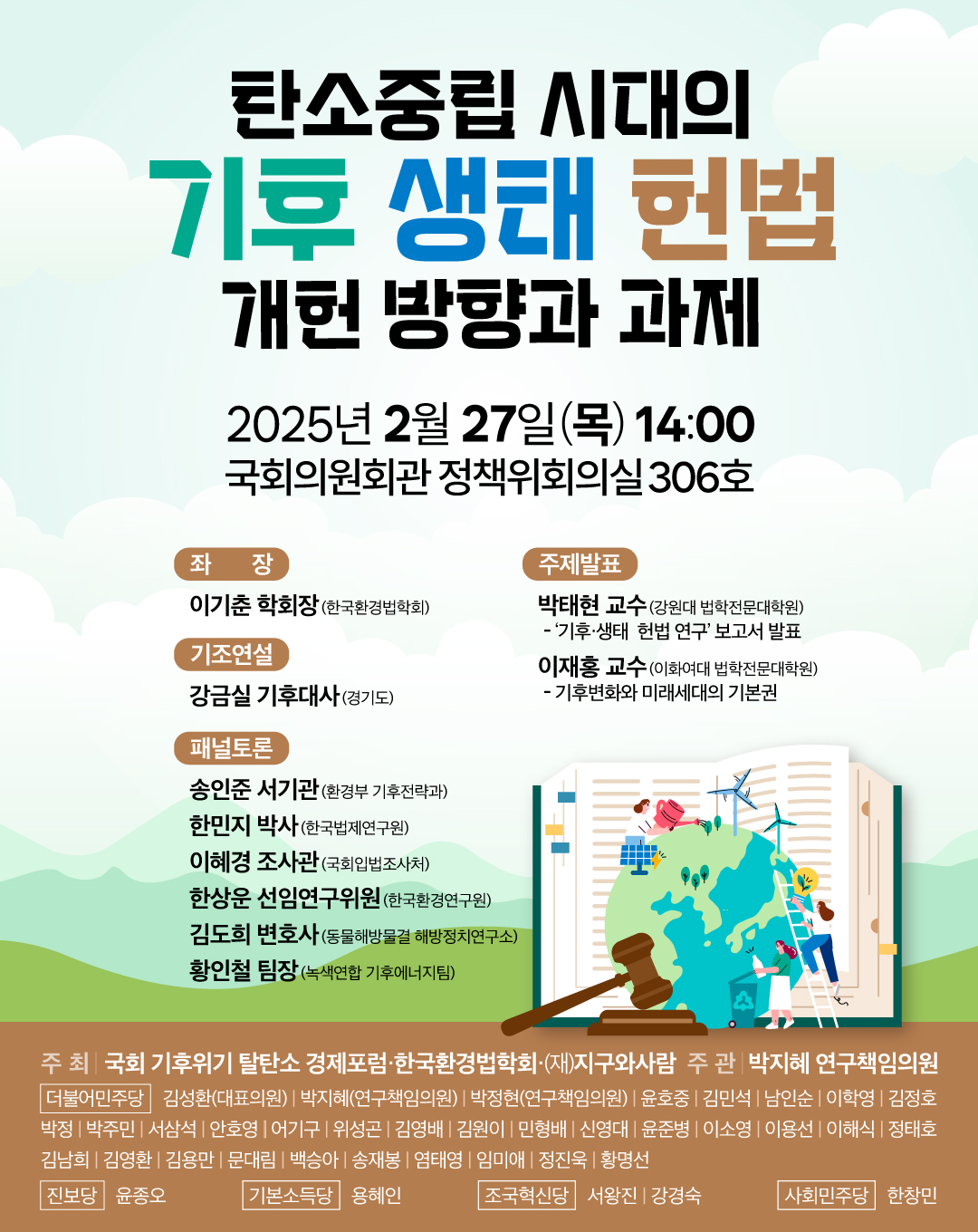 국회 기후위기 탈탄소 경제포럼과 한국환경법학회, 지구와사람 재단이 공동주최하는 이번 세미나에서는 기후 생태 헌법 개정을 둘러싸고 다양한 패널들의 발제와 토론이 진행될 예정이다.