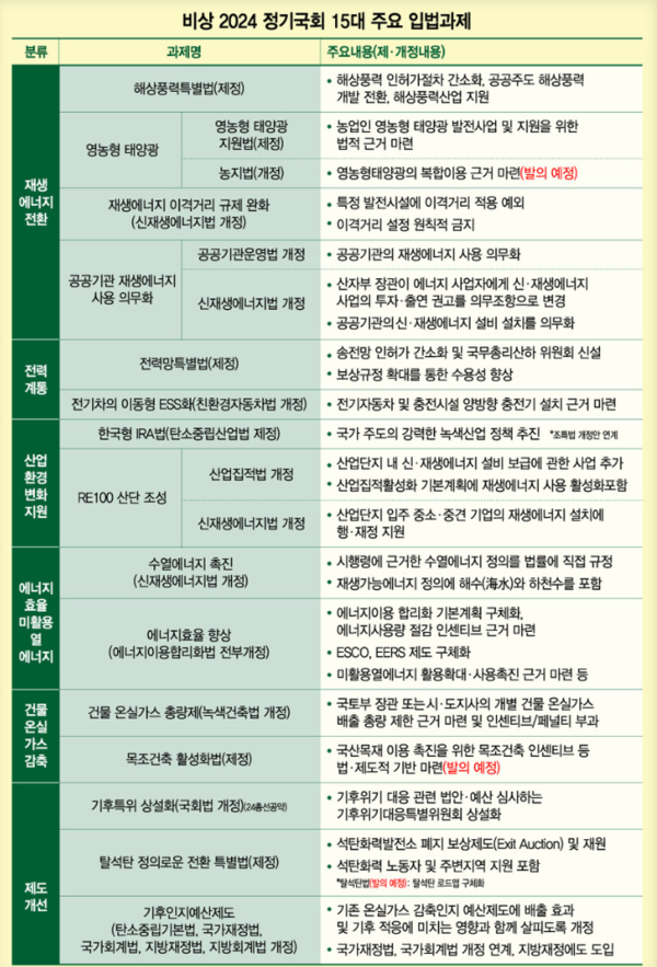 ‘비상’이 대한민국의 기후위기 대응과 탄소중립 사회 전환을 위한 분야별 과제를 발굴한 입법과제는 ▶재생 에너지 전환 ▶전력계통 ▶산업환경 변화 지원 ▶에너지효율 향상과 미활용 에너지 활용 ▶건물 온실가스 감축 ▶제도개선 등 총 6개 분야 15대다.