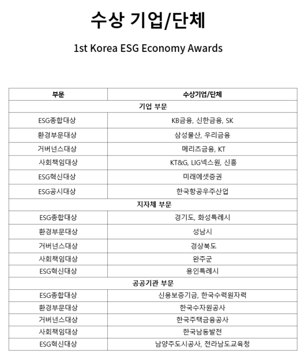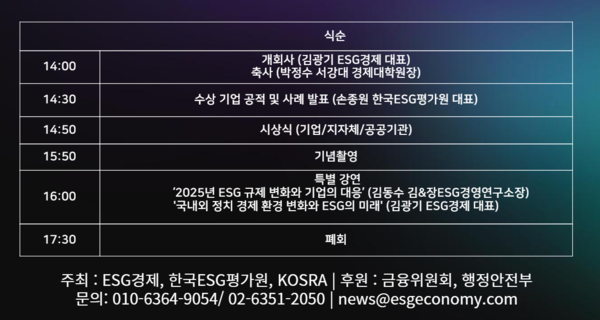 시상식 뒤에는 최근 국내외 ESG 동향을 심층 진단하는 특별강연 행사도 열린다. '2025년 ESG트렌드와 기업의 대응' 이란 주제로 김동수 김&장ESG경영연구소장이 발표하고, '국내외 정치 경제 환경의 변화와 ESG의 미래'에 대해 김광기 ESG경제 대표가 강연한다.