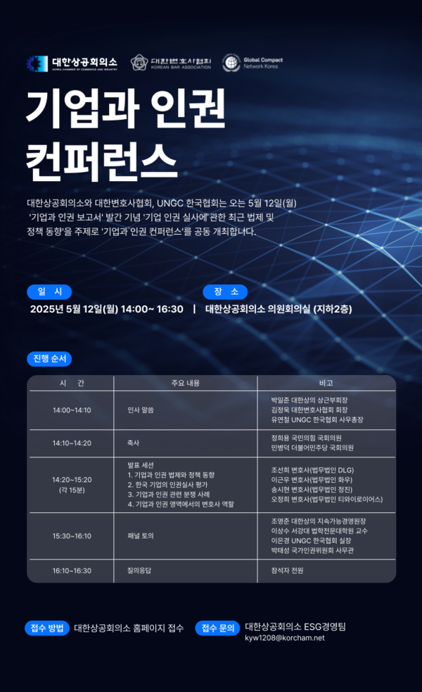 [ESG경제신문=주현준기자] ‘기업과 인권’ 보고서 발간을 기념하는 ‘기업과 인권 컨퍼런스’가 오는 5월 12일 대한상공회의소 의원회의실에서 개최된다.