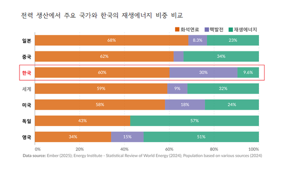 우선 태양광과 풍력 확대를 중심으로 방향이 바뀔 에너지전환을 주목해볼 필요가 있다. 잘 알려진 것처럼, 한국은 2020년 기준 태양광이 4.1기가와트가 신설될 정도로 성장 속도가 빨랐지만, 윤석열 정부의 ‘반 재생에너지 정책’ 탓으로 2022년이 되면서 2.7와트까지 연간 설치 규모가 크게 떨어졌다. 지난해에 간신히 3기가와트로 회복되었고 그 결과 최근 재생에너지 비중이 10%를 넘겼지만, 여전히 OECD 최하위 수준이다. 그러므로 새 정부에서 신설될 기후에너지부의 가장 긴급한 과제는 바로 재생에너지 후진국에서 탈출하는 것이다.