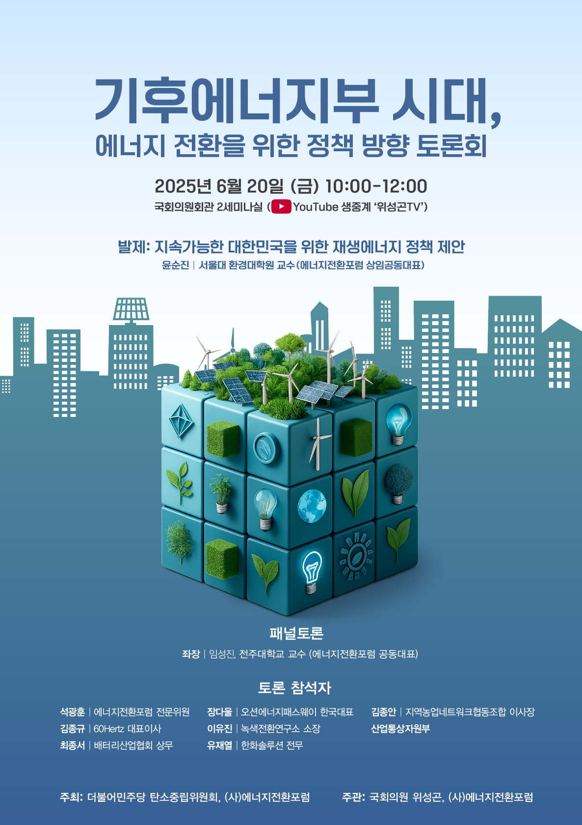 [ESG경제신문=김연지 기자] 더불어민주당 위성곤 의원실과 에너지전환포럼이 오는 20일 국회의원회관에서 '기후에너지부 시대, 에너지 전환을 위한 정책 방향 토론회'를 개최한다.