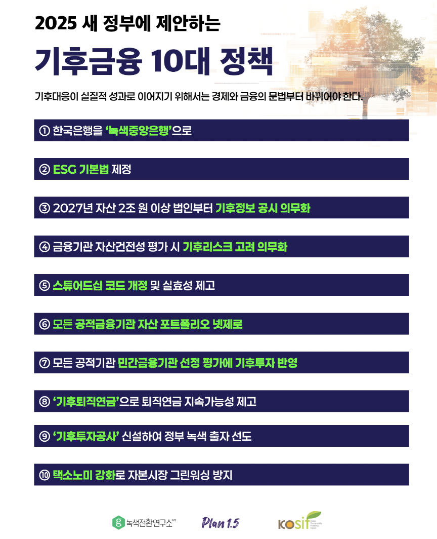 이들 기관이 제안한 기후금융 정책은 ▲한국은행의 녹색중앙은행 전환 ▲ESG 기본법 제정 ▲2027년 자산 2조 원 이상 법인부터 기후정보 공시 의무화 ▲금융기관 자산건전성 평가 시 기후리스크 고려 의무화 ▲스튜어드십 코드 개정 및 실효성 제고 ▲스튜어드십 코드 개정 및 실효성 제고 ▲모든 공적기관 민간금융기관 선정 평가에 기후투자 반영 ▲‘기후퇴직연금’으로 퇴직연금 지속가능성 제고 ▲‘기후투자공사’ 신설하여 정부 녹색 출자 선도 ▲택소노미 강화로 자본시장 그린워싱 방지 등이다.