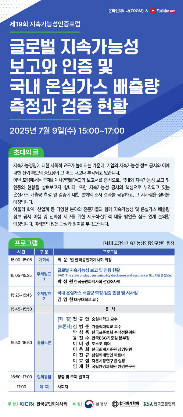 박성원 한국공인회계사회 선임조사역과 김임현 대구대학교 교수가 주제 발표를 맡아 각각 글로벌 지속가능성 보고 및 인증 현황과 국내 온실가스 배출량 측정·검증 현황 및 시사점에 대해서 발표한다.