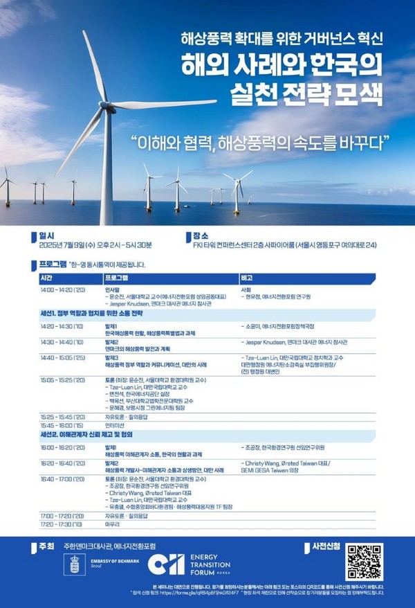 아울러 예스퍼 크누센 (Jesper Knudsen) 주한덴마크대사관 에너지 참사관도 참석해 덴마크의 해상풍력 정책 거버넌스 사례를 소개할 예정이라고 포럼은 설명했다. 세미나는 대면으로 진행되며, 행사 안내 포스터의 QR코드를 통해 참가 신청할 수 있다.