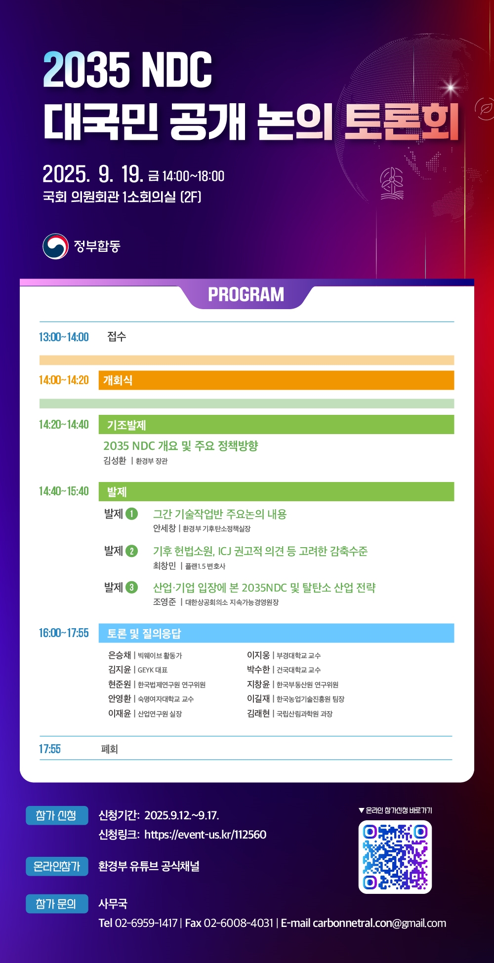 이어 ▲그간 기술작업반 주요논의 내용(환경부 안세창 탄소정책실장) ▲기후 헌법소원, ICJ 권고적 의견 등 고려한 감축수준(플랜 1.5 최창민 변호사) ▲산업·기업 입장에서 본 2035NDC 및 탈탄소 산업 전략(대한상공회의소 조영준 지속가능경영원장) 등의 발제가 진행될 예정이다.