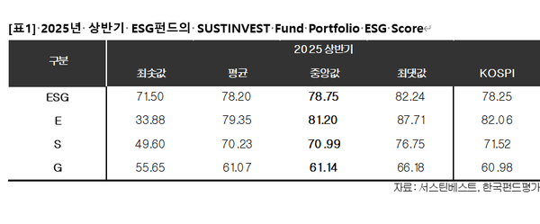 25일 ESG 평가 및 투자자문기관 서스틴베스트가 발간한 ‘2025H1 ESG 펀드시장 리뷰’에 따르면 올 상반기 국내주식형 ESG펀드 56개를 대상으로 ESG 성과를 분석한 결과, 주식형 ESG펀드의 ESG 성과는 78.75점으로, KOSPI(78.25점)와 비ESG펀드(77.76점)를 모두 상회했다. 다만 그 격차는 좁혀지는 추세를 보였다.