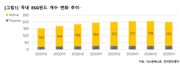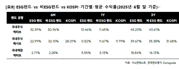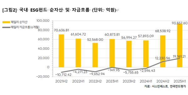 한편, 2025년 6월 말 기준 국내 ESG 펀드시장 순자산은 9조 3838억원으로 지난해 말 6조 8539억원 대비 약 37% 증가했다.