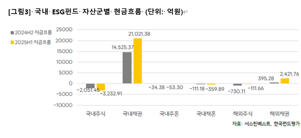 올해 상반기 자금흐름은 1조 9161억원 순유입을 기록했다. 특히, 2024년 하반기에 이어 국내채권형 ESG펀드로 두드러진 자금 유입이 지속되는 모습이 나타났다.