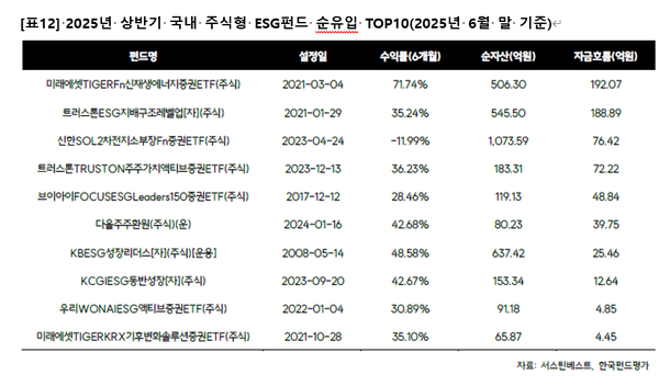 2025년 상반기 국내주식형 ESG펀드는 순유출을 기록했다. 보고서는 일부 차익실현과 특정 섹터 및 테마 펀드로의 자금 집중에 따른 결과로 풀이했다. 반면, 같은 기간 자금유입을 기록한 국내주식형 ESG펀드는 새 정부의 친환경 에너지 육성과 주주환원 확대 등의 정책과 관련된 펀드였다고 보고서는 밝혔다.