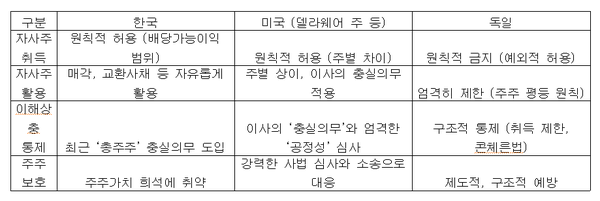 결론적으로 미국은 사후적·사법적 통제에, 독일은 사전적·입법적 통제에 중점을 둠으로써 자사주가 지배주주의 사익 추구 수단으로 남용될 소지를 차단하고 있다.