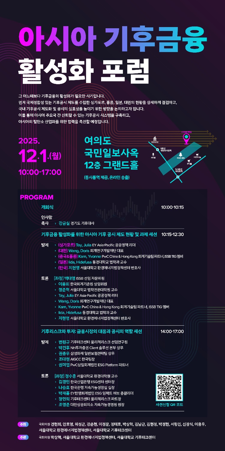 이날 포럼에는 '기후금융 활성화를 위한 아시아 기후 공시 제도 현황 및 과제'를 주제로 싱가포르, 대만, 중국, 일본, 한국 등 각국의 연사들이 발제를 진행한다. 토론 순서에는 백태영 ISSB 선임 자문위원이 좌장을 맡아 ▲이웅희 한국회계기준원 상임위원 ▲정준혁 서울대학교 법학전문대학원 교수 ▲지현영 서울대학교 환경에너지법정책센터 변호사 등이 패널로 참여할 예정이다.