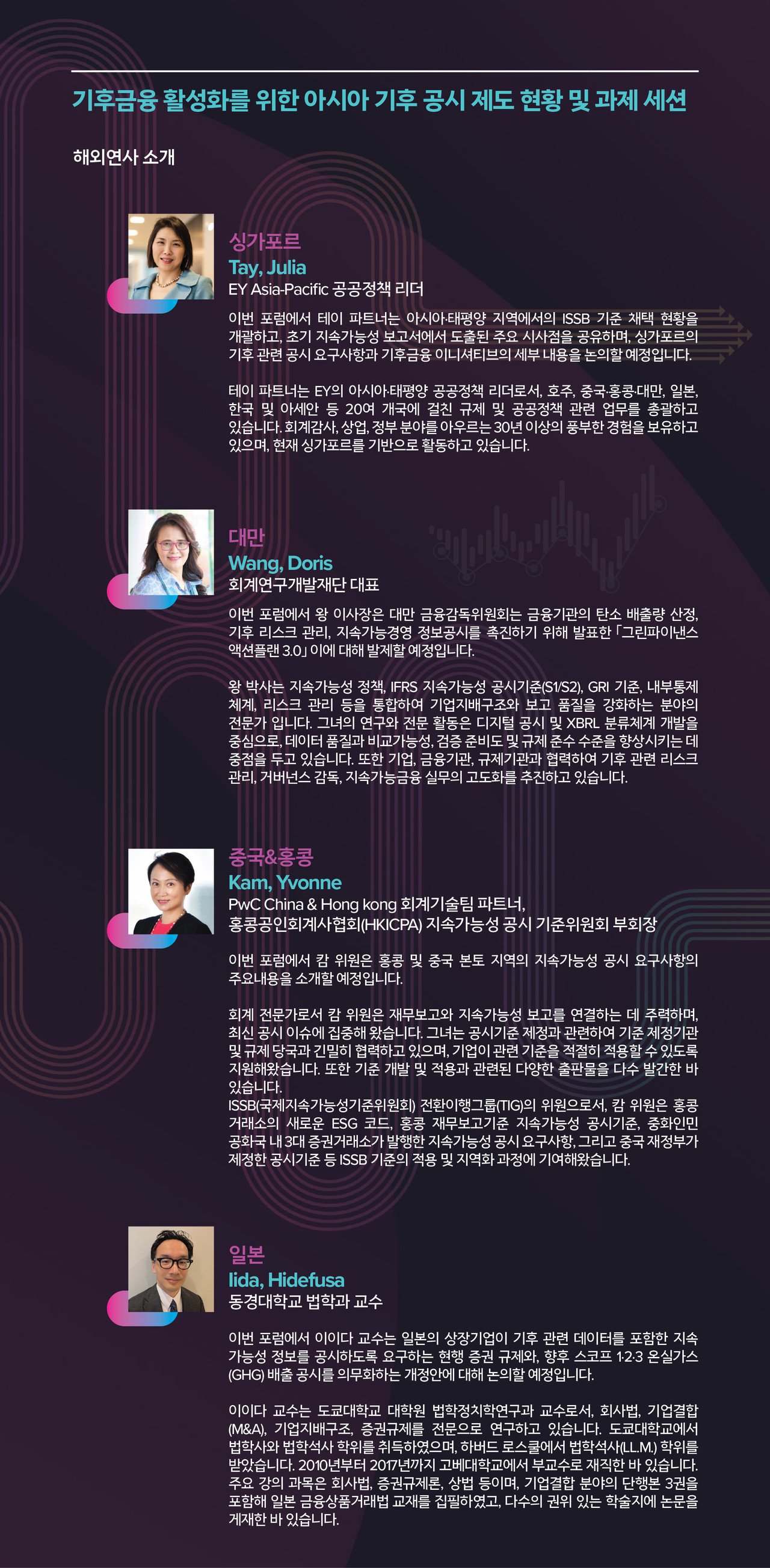 포럼 주최 측은 "우리보다 먼저 국제 정합성 있는 기후공시 제도를 수립하고 기후 금융 활성화를 위해 노력하고 있는 주요 아시아 국가들(싱가포르, 홍콩, 일본, 대만)의 현황을 상세히 점검하고 국내 기후 공시 제도화 및 공시의 실효성을 높이기 위한 방향을 논의하는 자리가 될 것"이라고 말했다.