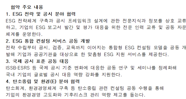 양 기관은 협약을 통해 ▲ESG 전략 및 공시 프레임 설계 ▲제3자 검증 프로세스 구축 ▲탄소중립·환경(E) 컨설팅 공동 수행 ▲공동 세미나 및 교육사업 운영 ▲중소기업 ESG 지원 등 다양한 영역에서 협력하기로 합의했다.