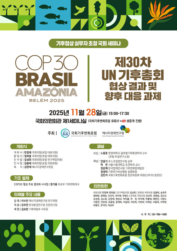 국회기후변화포럼(대표의원 한정애·정희용)이 오는 28일 제30차 유엔기후변화협약 당사국총회(COP30)의 대한민국 정부대표단을 초청해 ‘COP30 협상 결과 및 향후 대응 과제’를 주제로 세미나를 개최한다.