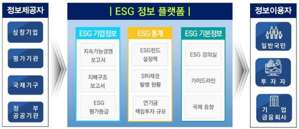 또한 기업들이 공시하는 지속가능경영보고서와 지배구조보고서 등을 곧바로 확인할 수 있다. ESG 통계 항목에서는 ESG 책임투자규모, ESG 펀드 설정액·수익률, ESG 채권(SRI채권) 발행 현황 등을 볼 수 있다.