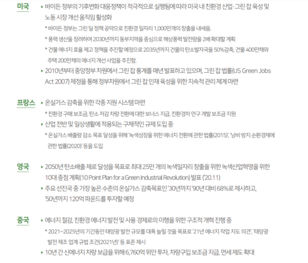 에너지원 및 에너지 고효율화 분야는 선진국의 적극적인 탄소중립 정책 추진으로 각광받는 분야다. 코트라는 재생에너지 산업의 고용 창출효과가 화석연료 산업대비 3배나 높다고 밝혔다.