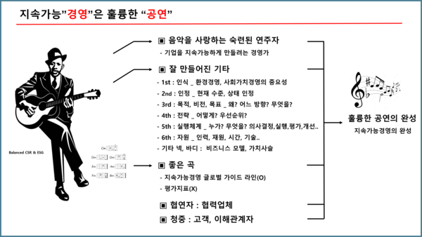 기타의 본체가 깨지거나 뒤틀려있으면 제대로된 연주가 불가능하듯이 비즈니스 모델과 가치사슬에 지속가능경영을 위한 준비가 제대로 되어있지 않으면 ESG경영도 제대로 할 수 없다.