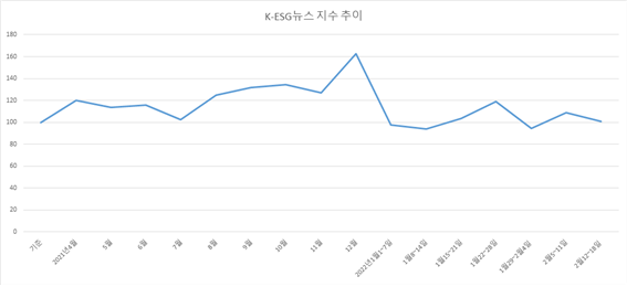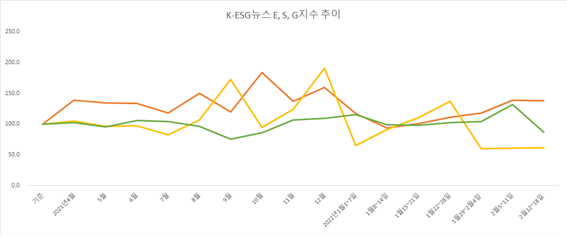 ◇ K-ESG지수는 : 본지 산하 ESG경제연구소가 개발한 K-ESG뉴스지수는 국내 54개 주요 신문과 방송에 보도된 ESG 관련 뉴스(주당 평균 5000건)에 들어있는 ESG 요소(키워드)들의 긍정, 부정 내용을 평가하여 점수화한다. 지수는 E/S/G 요소별 분야와 ESG종합으로 각각 발표되며, 지난해 1분기 점수를 100(기준점)으로 하여 산출한다.