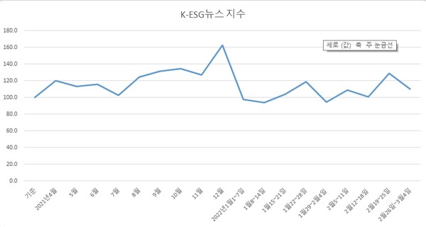 7일 본지 산하 ESG경제연구소가 자체 개발한 'K-ESG뉴스지수'를 분석한 결과에 따르면 3월 첫째주(2월26일~3월4일) 'ESG종합지수'는 110.3 포인트를 기록해 2월 넷째주(128.8) 대비 18.5 포인트 하락했다.