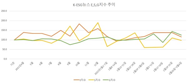 ◇ K-ESG지수는 : 본지 산하 ESG경제연구소가 개발한 K-ESG뉴스지수는 국내 54개 주요 신문과 방송에 보도된 ESG 관련 뉴스(주당 평균 5000건)에 들어있는 ESG 요소(키워드)들의 긍정, 부정 내용을 평가하여 점수화한다. 지수는 E/S/G 요소별 분야와 ESG종합으로 각각 발표되며, 지난해 1분기 점수를 100(기준점)으로 하여 산출한다.