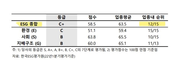 한편 평가원은 금호석유화학의 ESG평가등급을 C+로 부여했다. 이는 업종평균을 크게 하회하는 수준으로, 업종 내 15개 기업 중 12위에 해당한다. 특히 사회(S)부문과 지배구조(G) 부문이 B등급인데 반해 환경(E)부문은 C등급에 그쳐 환경부문 ESG 경영이 미흡한 것으로 나타났다.