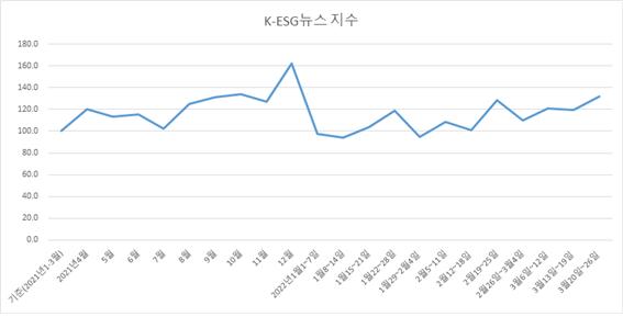 28일 본지 산하 ESG경제연구소가 자체 개발한 'K-ESG뉴스지수'를 분석한 결과에 따르면 3월 넷째주(3월20일~3월26일) 'ESG종합지수'는 132.1 포인트를 기록해 3월 셋째주(119.9) 대비 12.5 포인트 올랐다.