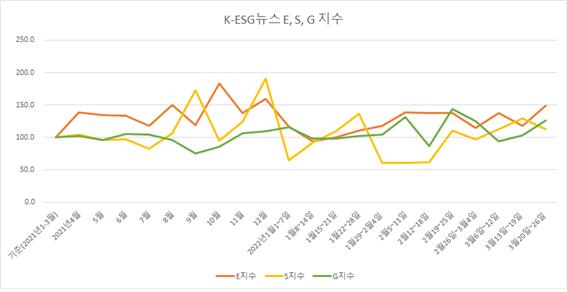 ◇ K-ESG지수는 : 본지 산하 ESG경제연구소가 개발한 K-ESG뉴스지수는 국내 54개 주요 신문과 방송에 보도된 ESG 관련 뉴스(주당 평균 5000건)에 들어있는 ESG 요소(키워드)들의 긍정, 부정 내용을 평가하여 점수화한다. 지수는 E/S/G 요소별 분야와 ESG종합으로 각각 발표되며, 지난해 1분기 점수를 100(기준점)으로 하여 산출한다.