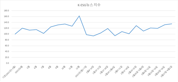 4일 본지 산하 ESG경제연구소가 자체 개발한 'K-ESG뉴스지수'를 분석한 결과에 따르면 3월 다섯째주(3월27일~4월2일) 'ESG종합지수'는 134.9 포인트를 기록해 3월 넷째주(132.1) 대비 2.8 포인트 올랐다.