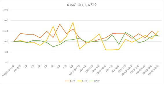 ◇ K-ESG지수는 : 본지 산하 ESG경제연구소가 개발한 K-ESG뉴스지수는 국내 54개 주요 신문과 방송에 보도된 ESG 관련 뉴스(주당 평균 5000건)에 들어있는 ESG 요소(키워드)들의 긍정, 부정 내용을 평가하여 점수화한다. 지수는 E/S/G 요소별 분야와 ESG종합으로 각각 발표되며, 지난해 1분기 점수를 100(기준점)으로 하여 산출한다.