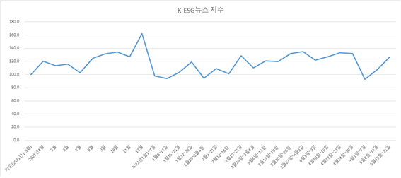 본지 산하 ESG경제연구소가 자체 개발한 'K-ESG 뉴스지수'를 분석한 결과에 따르면 5월 셋째주(5월15일~21일) 'ESG종합지수'는 126.5 포인트를 기록해 5월 둘째주(107.2) 대비 19.3 포인트 상승했다.