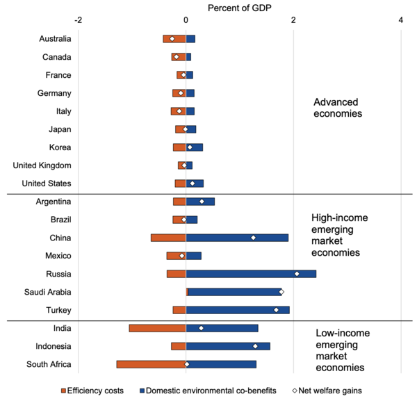 IMF는 2030년까지 미국과 일본, 한국 등 선진국은 톤당 50 달러의 최저 탄소 가격을 적용하고 신흥국에 50 달러, 저개발국에는 25 달러의 최저 탄소 가격을 적용해야 한다고 제안했다.