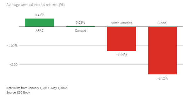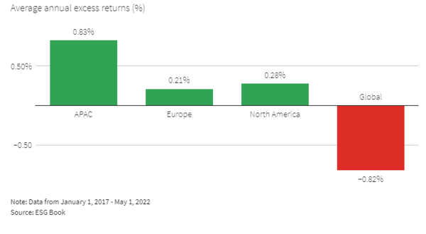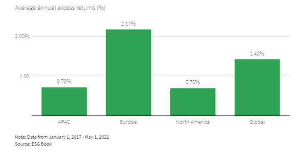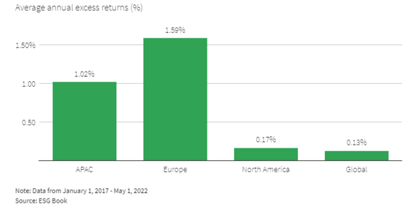 ESG 북이 2017년 1월부터 2022년 4월까지 5년간의 성과를 분석해본 결과, ESG 선두기업들 편입 비중이 높은 유럽 주식 모델 포트폴리오의 연평균 수익률이 '가중치를 두지 않은(unweighted)' 벤치마크보다 1.59% 높아 지역별로 가장 좋은 성과를 나타냈다.