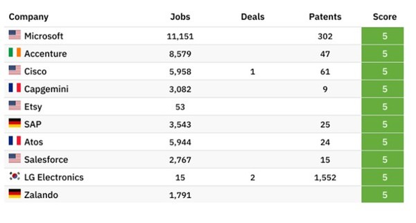 3위부터 10위까지는 시스코, 캡제미니(Capgemini), 엣시(Etsy), SAP, 아토스(Atos), 세일즈포스(Salesforce), LG전자, 잘란도(Galando) 순이었다.