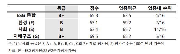한편, 한화솔루션의 ESG평가는 종합등급은 B+로 우수한 수준이다. 동종 업계인 16개 화학업종 기업 중 4위에 랭크된 우수한 평가다. 환경부문에서 사업구조의 이점을 활용하여 상대적으로 높은 평가를 얻은 점이 종합점수에 긍정적으로 작용했다. 사회부문의 낮은 점수가 아쉬운 점으로 평가됐지만, 중장기적으로 다양한 사회책임 활동을 통해 충분히 평가 개선을 기대해볼 만하다.