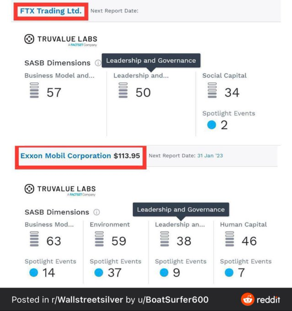 FTX의 ESG 등급이 엑손모빌보다 높다는 사실이 담긴 이미지(아래)는 트위터 등 SNS를 통해 급속히 퍼졌다.