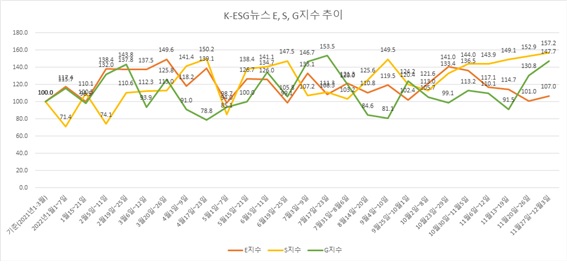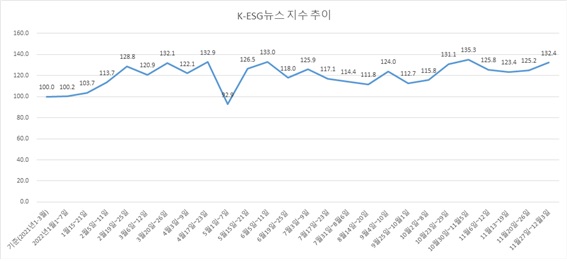 한국ESG평가원 산하 ESG경제연구소가 자체 개발한 ‘K-ESG 뉴스지수’ 의 5일 분석 결과를 보면, 12월 첫째 주(11월27일~12월3일) 의 ESG종합지수는 132.4로 전주(11월 20~26일)에 견줘 7.2포인트 올랐다. 2주 연속 상승세다.