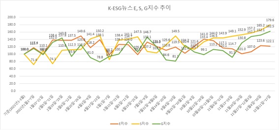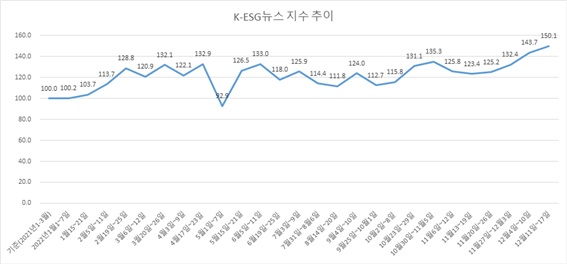 본지 산하 ESG경제연구소가 자체 개발한 'K-ESG 뉴스지수' 19일 분석 결과를 보면, 12월 셋째 주(12월 11~17일) ESG종합지수는 150.1로 전주(12월 4~10일)에 비해, 6.4포인트 상승했다. 이는 올해 최고점인 전주 기록(143.7)을 경신한 것이다. ESG종합지수는 지난 11월 마지막주(11월 20~26일)이후 4주 연속 올랐다.
