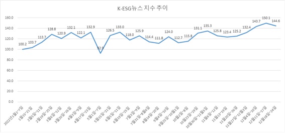 [ESG경제=권은중 기자] 연중 최고 기록을 2주 연속 갈아치웠던 ESG종합지수가 5주만에 숨고르기에 들어갔다. 본지 산하 ESG경제연구소가 자체 개발한 ‘K-ESG 뉴스지수’ 의 26일 분석 결과, 12월 넷째 주(12월 18~24일) ESG종합지수는 144.6으로 전주(12월 11~17일)에 견줘 5.5포인트 소폭 하락했다.