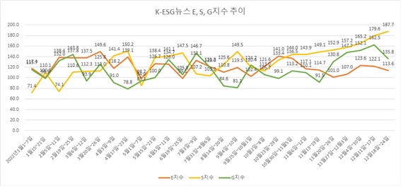 종합지수가 12월 넷째주에 주춤한 데 대해 ESG경제연구소 측은 "연말 마지막 주를 앞두고 ESG 관련 비전 선포나 시상식이 거의 마무리됐고 횡령 등의 거버넌스 관련 부정적인 보도가 늘어난 때문"이라고 풀이했다.
