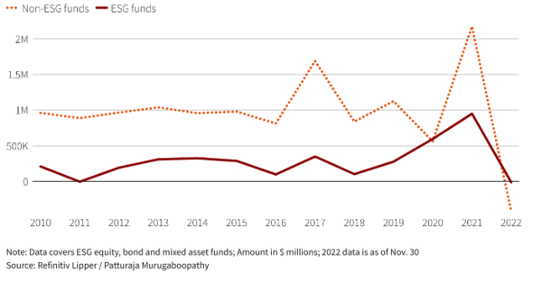 레피니티브 리퍼(Refinitiv Lipper) 데이터에 따르면 투자자들은 11월 말까지 ESG 주식과 혼합형 자산펀드에서 132억 달러(약 17조 원)의 투자금을 순유출했다. 2011년 이후 처음 일어난 순유출이다.