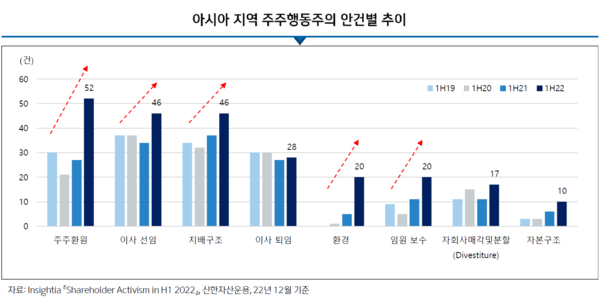 하지만 ESG 투자의 활성화와 더불어 아시아에서도 주주행동주의가 확산하기 시작했고 한국이 이런 흐름을 주도할 기운이 엿보인다. 신한자산운용이 최근 내놓은 ‘2023년 ESG 투자 시장 전망’ 보고서를 보면 아시아 지역에서 주주행동주의의 대상이 된 기업은 2021년 134개였다가, 지난해에는 상반기에만 이에 버금가는 126개에 달했다. 특히 한국 기업은 2020년 10개에서 2021년 27개, 지난해 상반기에만 38개로 급증 추세였다.