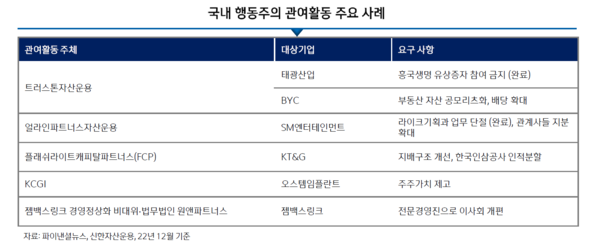 국내 자산운용 업계의 주주관여 활동도 더욱 구체화하고 본격화할 것으로 전망됐다.지금까지 국내 주주관여 활동은 외국계 헤지펀드가 주도했으나 2020년경부터 국내 자산운용사들의 주주관여 활동이 시작됐다는 것이 보고서의 분석이다. 보고서는 “단기 시세차익을 노리는 적대적인 기업 사냥꾼이 아니라 기업가치 제고를 위한 중장기 파트너로 주주관여 활동에 대한 인식 전환이 이루어지고 있다"고 설명했다.