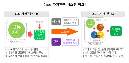 ESG 자가진단 2.0은 공통 지표 29개, 산업별 지표 13개, 대기업 협력사 및 수출국별 지표 41개 등 총 83개의 지표로 구성돼 기존 시스템(23개 지표로 구성) 보다 더욱 세부적이고 정교한 솔루션을 제공한다.