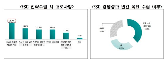 ESG 관련 전략 수립에 애로요인을 묻는 질문에 대해서는 응답자의 29.7%가 'ESG의 모호한 범위와 개념'을 꼽았다. 이어 자사 사업과 낮은 연관성(19.8%), 기관마다 상이한 ESG 평가방식(17.8%), 추가비용 초래(17.8%), 지나치게 빠른 ESG 규제도입 속도(11.9%) 등을 꼽았다.