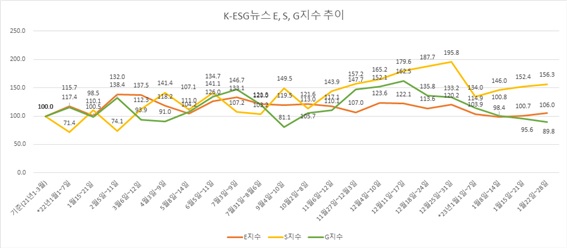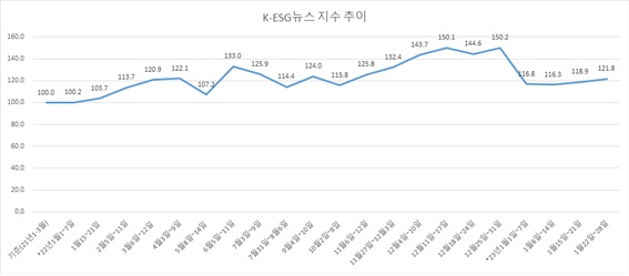 30일 본지 부설 ESG경제연구소가 자체 개발한 ‘K-ESG 뉴스지수’ 분석을 보면, 1월 넷째 주(1월22일~28일) ESG종합지수는 121.8로 그 전주인 1월 셋째 주(1월15일~21일) 대비 2.9포인트 상승했다. 1월초부터 2주 연속 하락했던 지수가 1월 셋째 주 반등한 이후 2주 연속 소폭이지만 상승세를 이어간 것이다.