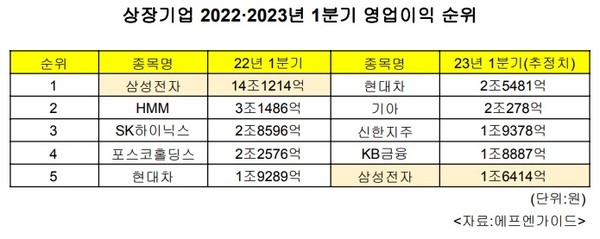 [ESG경제=권은중 기자] 현대자동차가 올해 처음으로 국내 상장사 가운데 1분기에 가장 많은 영업이익을 올린 기업에 오를 전망이다. 2009년 2분기 이후 이 부문 1위를 14년 동안 고수해온 삼성전자는 반도체 업황 악화로 영업익이 90% 가까이 줄면서 5위로 떨어질 전망이다.