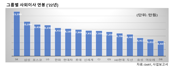 기업집단 별로 SK그룹이 두드러지게 많았고, DB그룹이 가장 적었다. SK그룹의 경우 5개사의 사외이사 연봉이 1억원을 넘어선 가운데 금액도 전년비 33% 급증했다. 업종 별로는 전기전자가 가장 많았고, 건설/유틸리티가 가장 적었다. 한국ESG평가원의 ESG평가 결과와 견줘보면 ESG등급이 높을수록 사외이사 연봉이 많은 상관성도 나타났다.