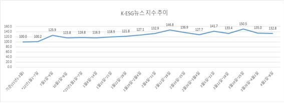 본지 부설 ESG경제연구소가 자체 개발한 ‘K-ESG 뉴스지수’의 10일 분석 결과, 4월 둘째 주(4월 2~8일) ESG종합지수는 132.8로 전주인 4월 첫째 주(3월 26일~4월 1일)에 견줘 2.2포인트 떨어졌다.