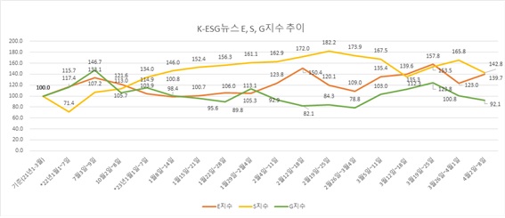 ◇ K-ESG 뉴스지수 : 국내 54개 주요 신문과 방송에 보도된 ESG 관련 뉴스(주당 평균 5000건)의 ESG 요소(키워드)들 중 긍정, 부정 내용을 평가하여 점수화한다. 지수는 E/S/G 요소별 분야와 ESG종합으로 각각 발표한다. 2021년 1분기 점수를 100(기준점)으로 해 산출한다. 지난주 ESG 관련 뉴스는 4725건으로 집계됐다.